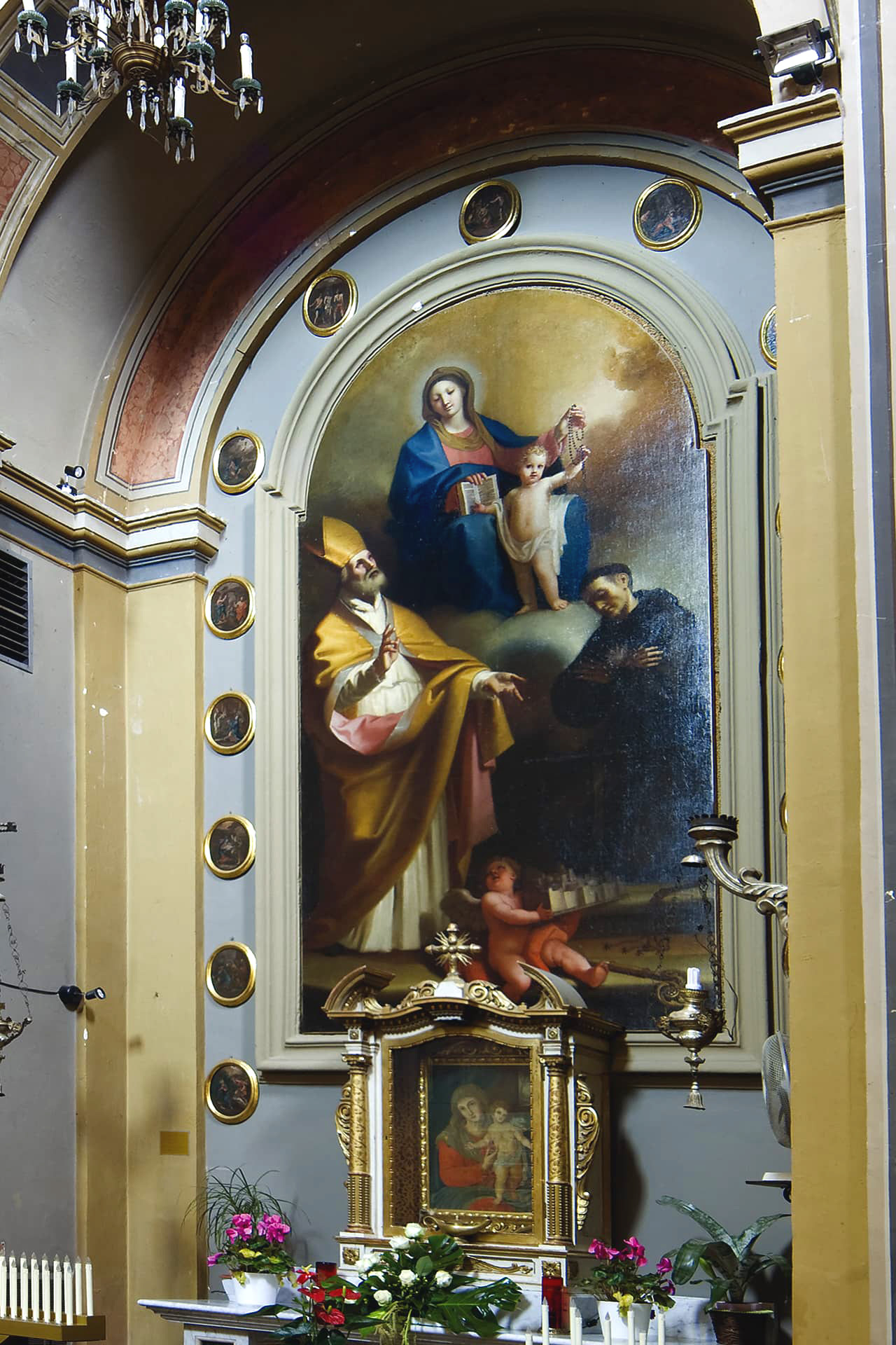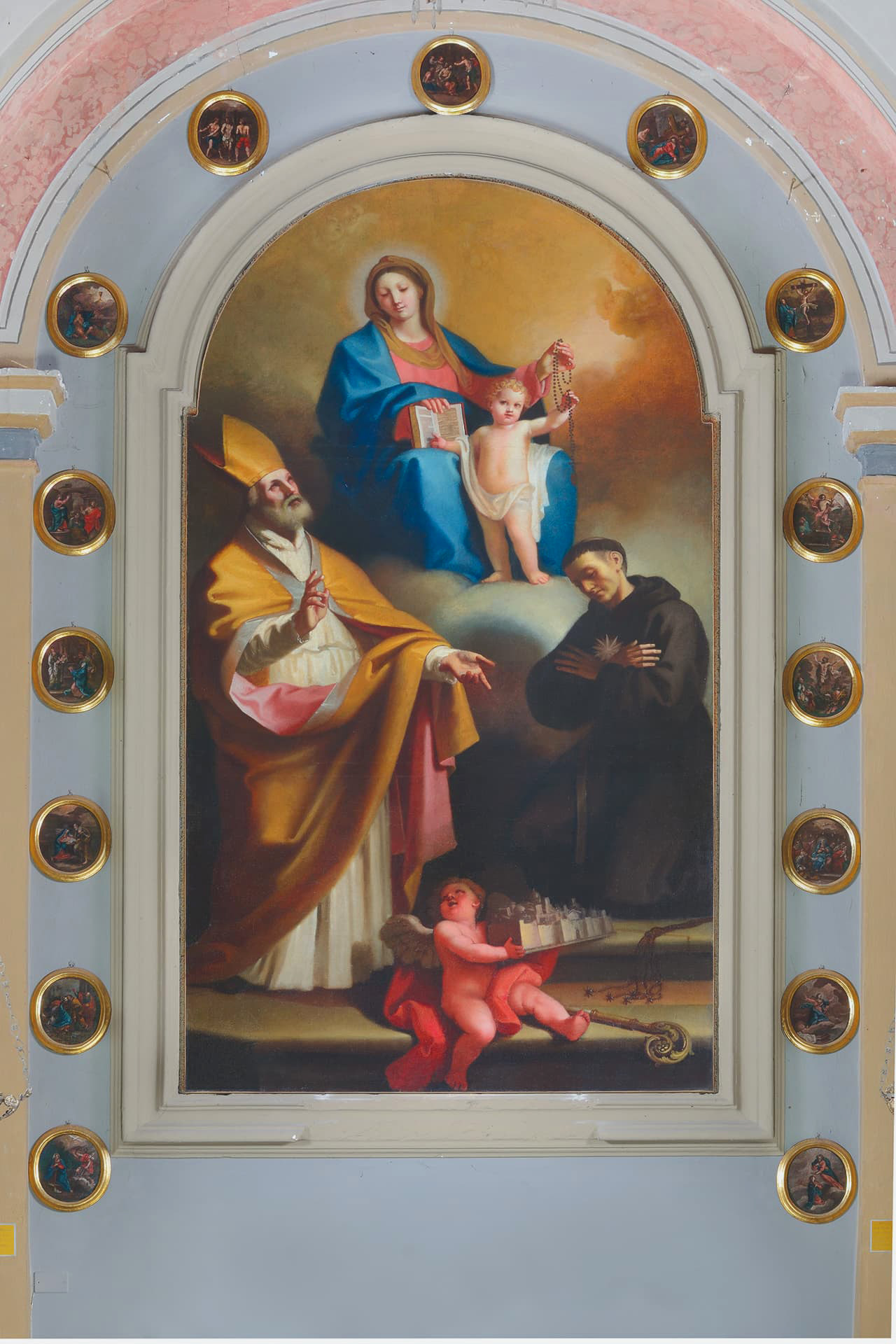 Un altro elemento di rilievo artistico è la tela della Madonna del Rosario, situata nella cappella laterale di destra. Nella parte superiore è rappresentata la Beata Vergine del Rosario, mentre nella parte inferiore, a sinistra, si trova Sant’Ubaldo Vescovo, che implora benedizione per il borgo di Gubbio, e a destra, San Nicola da Tolentino in ginocchio. Attorno alla tela sono disposti quindici medaglioni che rappresentano i Misteri del Rosario, scene bibliche che raccontano la storia della salvezza con colori delicati e armoniosi. Lo stile richiama l’influenza del pittore Domenico Corvi o di uno dei suoi allievi più esperti.